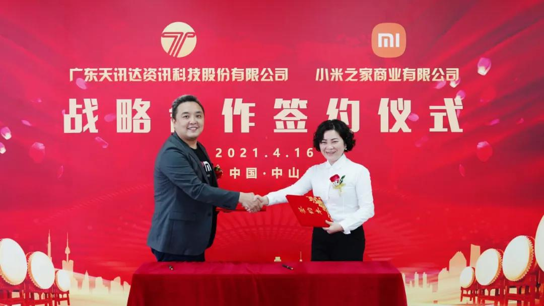 近日,健康基地集團園區(qū)企業(yè)廣東天訊達資訊科技股份有限公司(以下簡稱“天訊達”)與小米之家商業(yè)有限公司(以下簡稱“小米”)成功簽署戰(zhàn)略合作簽約。火炬開發(fā)區(qū)黨工委委員、管委會副主任黃宇健和中山市健康基地集團有限公司總經理萬鶴群見證了簽約儀式。