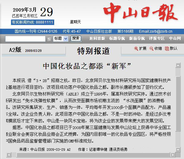 借“3·28”招商之機(jī),昨日,北京阿貝爾生物材料研究所與國(guó)家健康科技產(chǎn)業(yè)基地進(jìn)行項(xiàng)目簽約,該項(xiàng)目成功落戶中國(guó)化妝品之都。副市長(zhǎng)唐穎參加了簽約儀式。